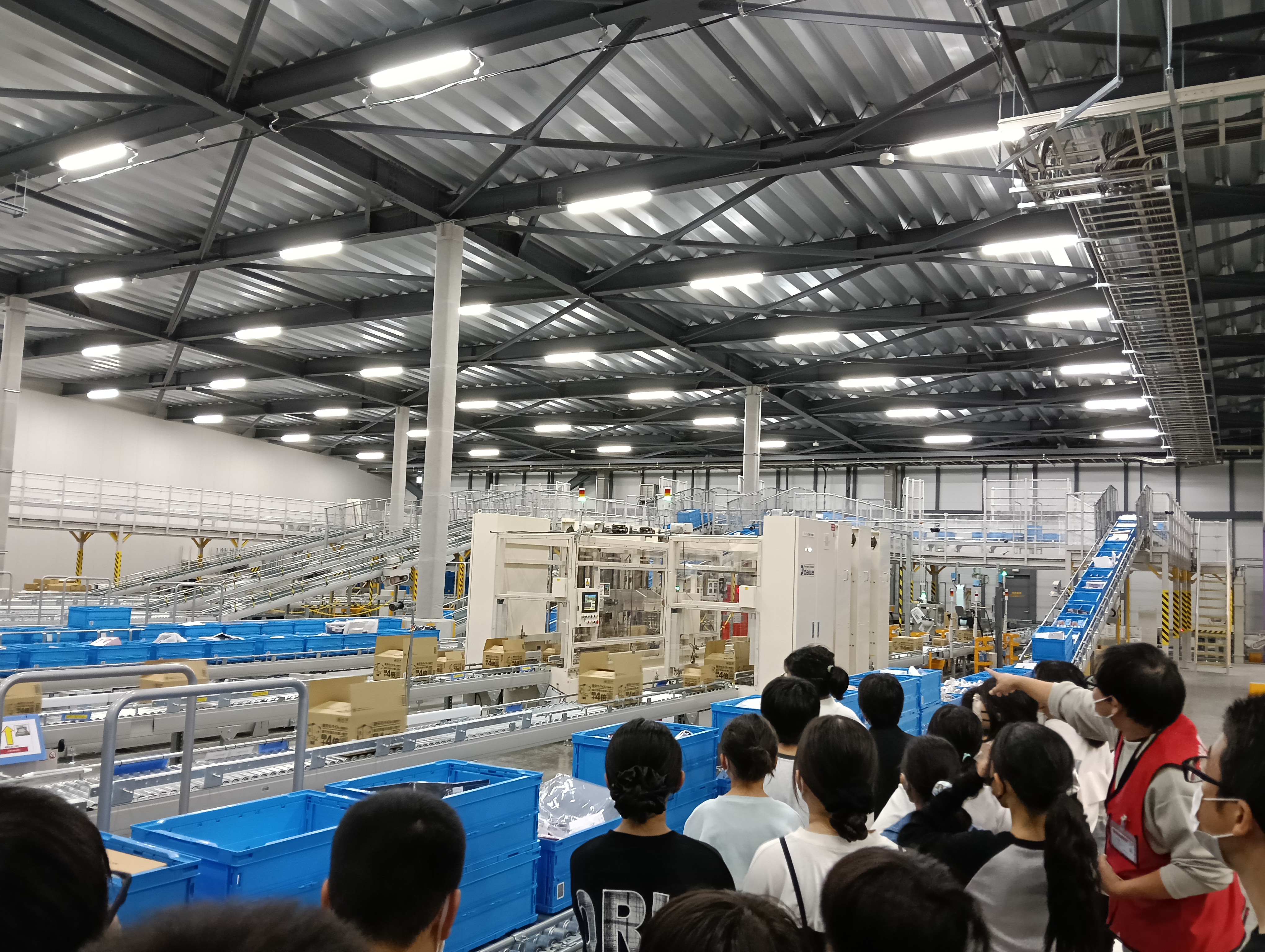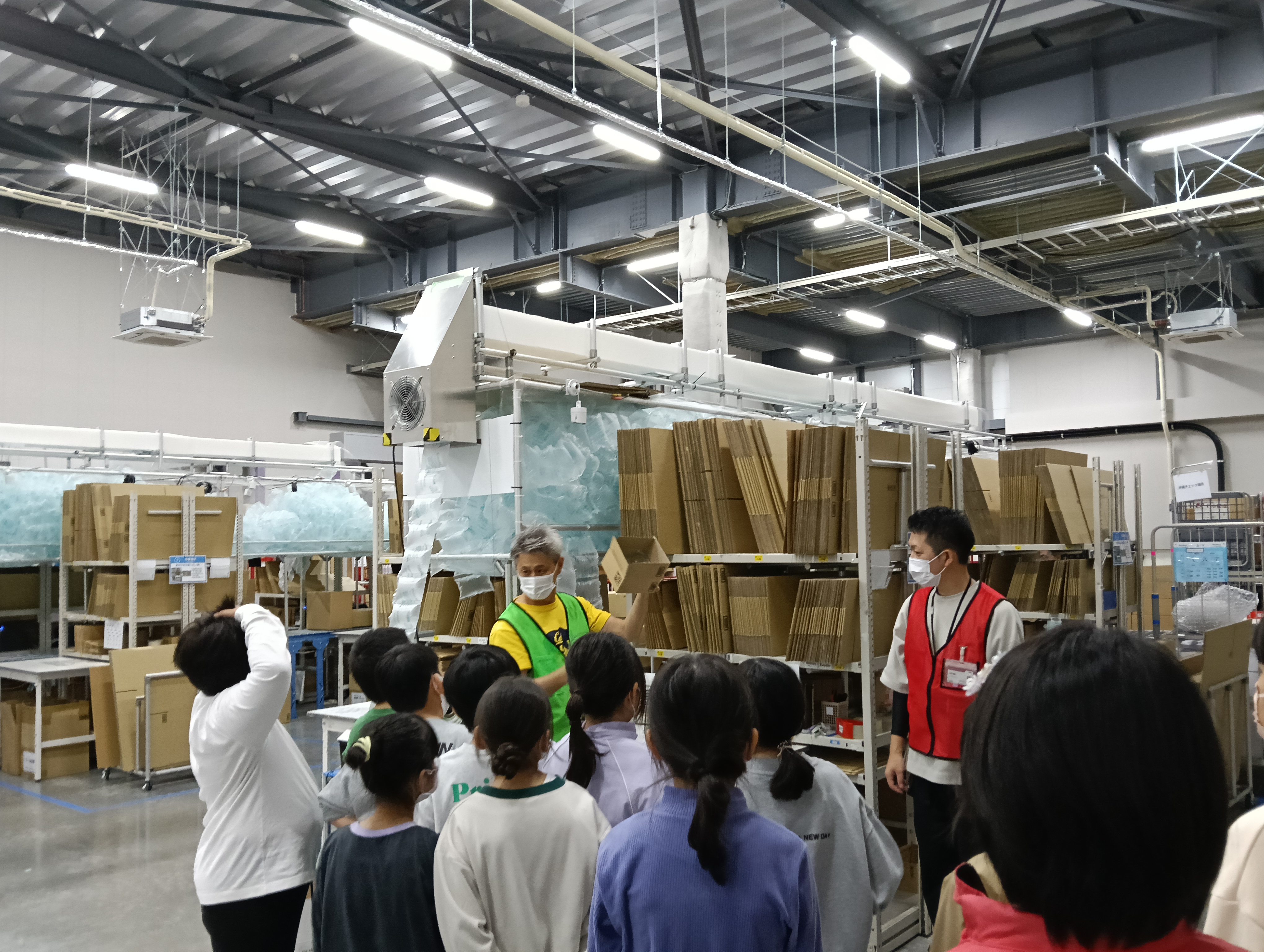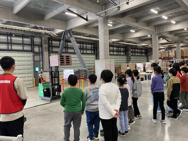 児童たちは、広い倉庫内を見学し、注文された商品がユーザーに発送されるまでの過程を学びました。